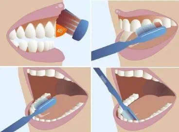 ① 将牙刷呈45°角指向牙龈方向,并轻轻靠在牙龈与牙齿的交界处,使一部分刷毛进入龈沟,一部分铺于龈缘上,并尽可能伸入邻牙间隙内。