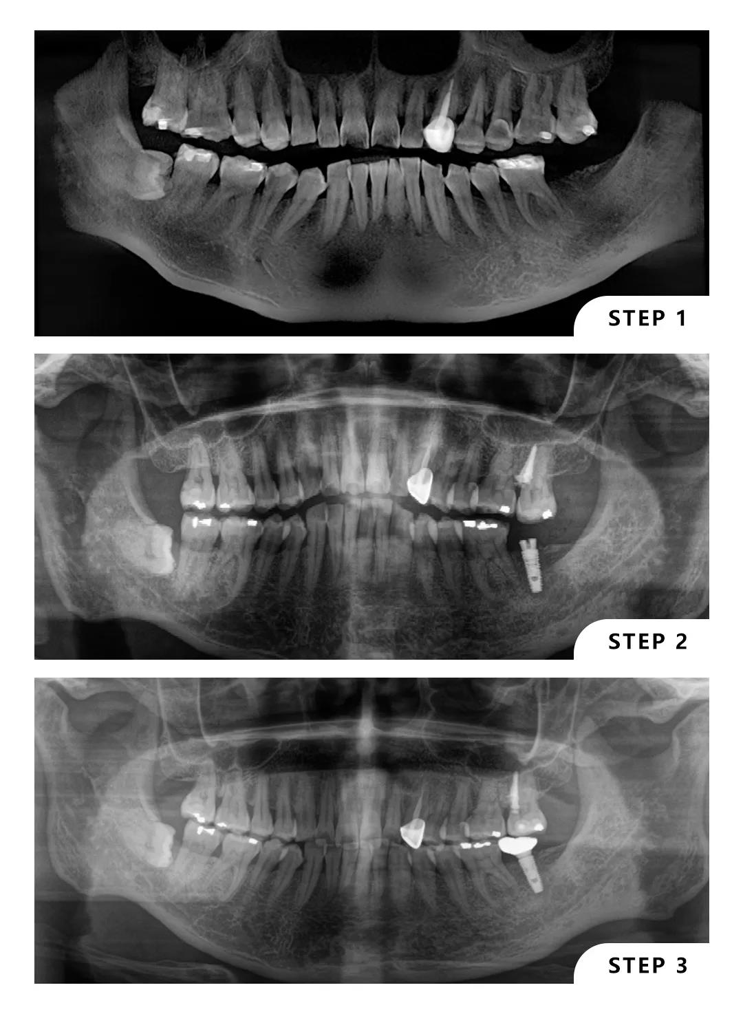 这位患者左下7缺失,左上7伸长,患者本人可以接受种植,但不接受磨牙。