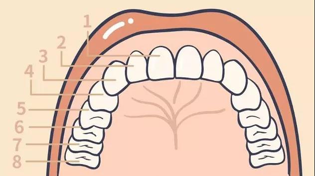 从门牙牙缝开始,由一侧门牙向里数牙齿数目,长在最后的第 8 颗牙齿,就是传说中的「智齿」,也是我们的第三磨牙。