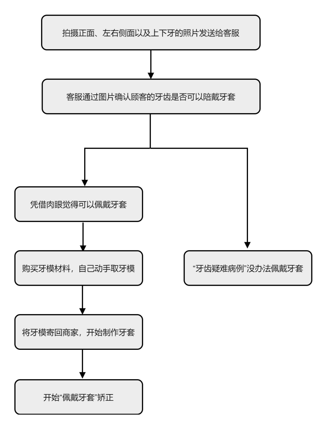 为了搞清楚网购牙套是什么神仙操作,小编专程了解了一下网购流程,基本如下(这是相对完整的流程,还有的连牙模都没有,直接推荐牙套):