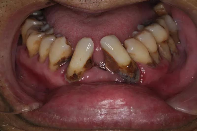 发展到现在,康老师的上颌已经完全没有牙齿了,下颌的牙齿也因为牙龈萎缩,松动地很厉害。