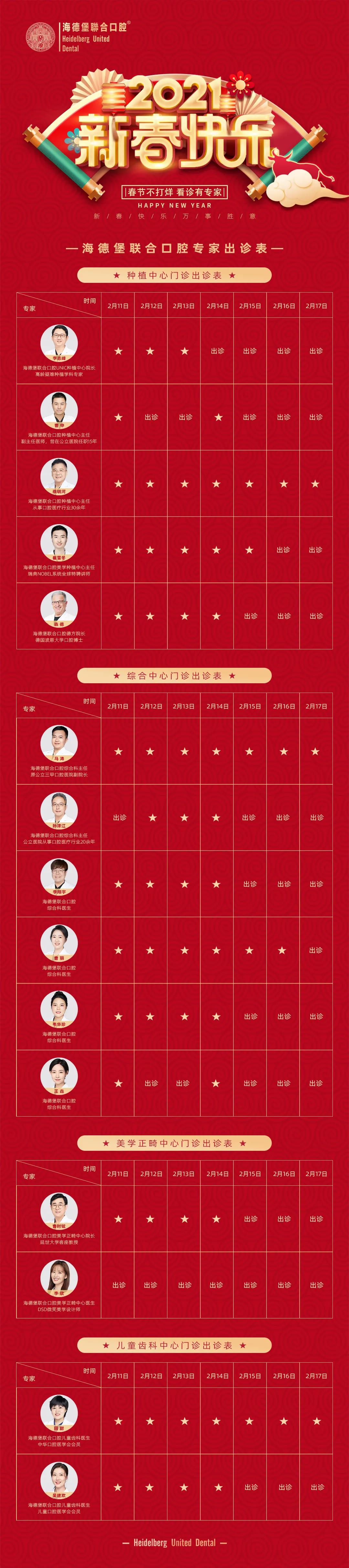 海德堡联合口腔多名专家和医生正常接诊,全面解决患者的就诊需求。春节假期七天的营业时间和医生的出诊日程如下: