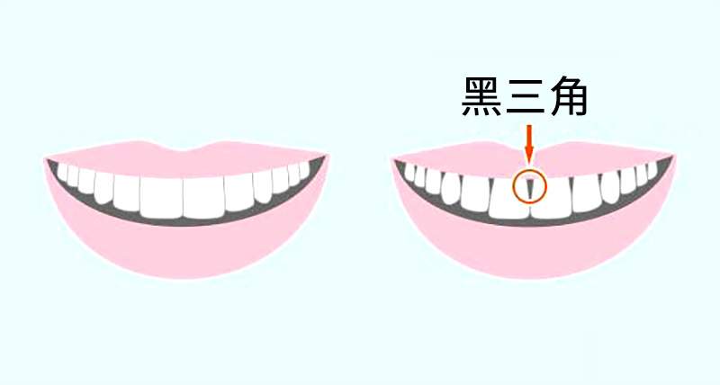 是矫正治疗后黑三角发生的一个明确因素。可以发现,黑三角很讨人厌,基本都出现在前面几颗牙之间(前牙区),就像是特意跑出来给人看的一样。